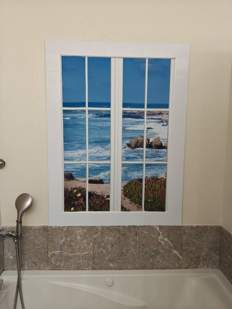 Wall mural window, self adhesive, Pacific ocean window view-Big Sur coast - 36 tall by 24 wide or 32wide by 48tall faux window frame, photo wall decal with an image of a window frame and Big Sur coast, beyond