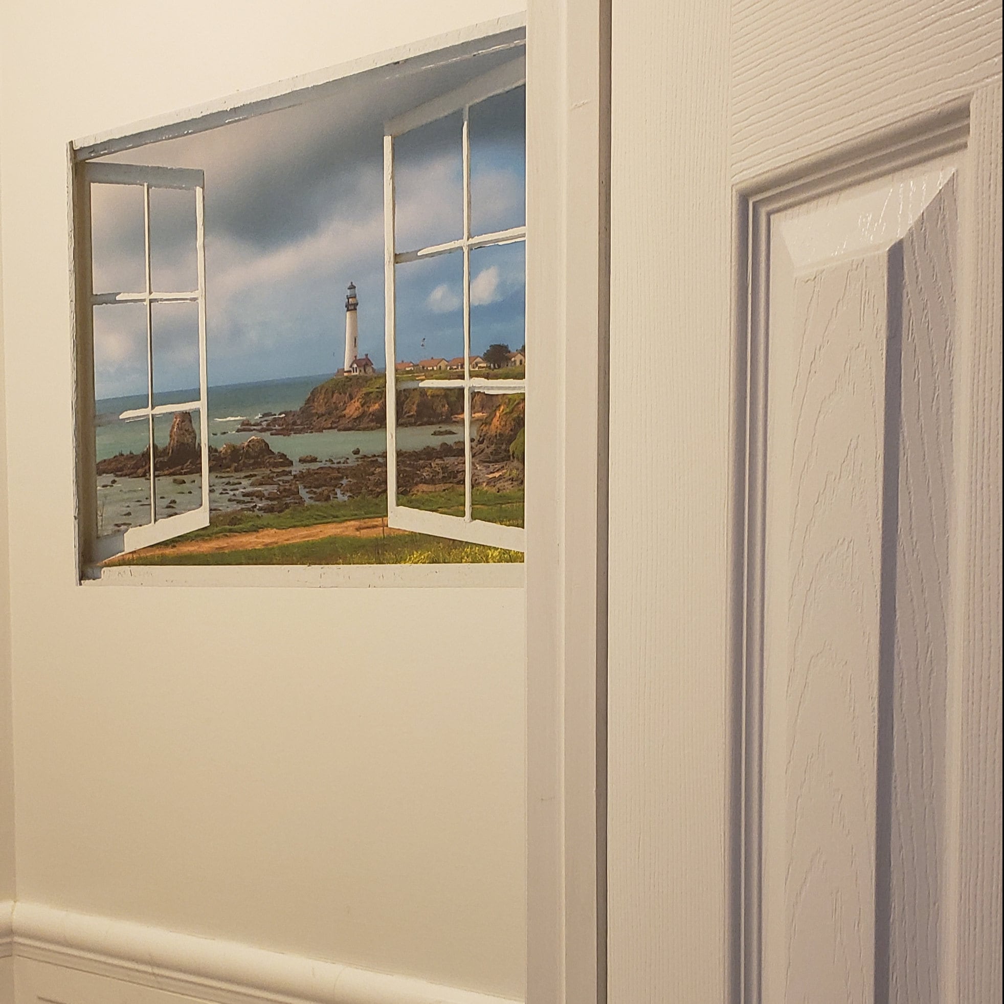 Faux window frame, photo wall decal with an image of a window frame and Big Sur Pigeon Point lighthouse beyond.