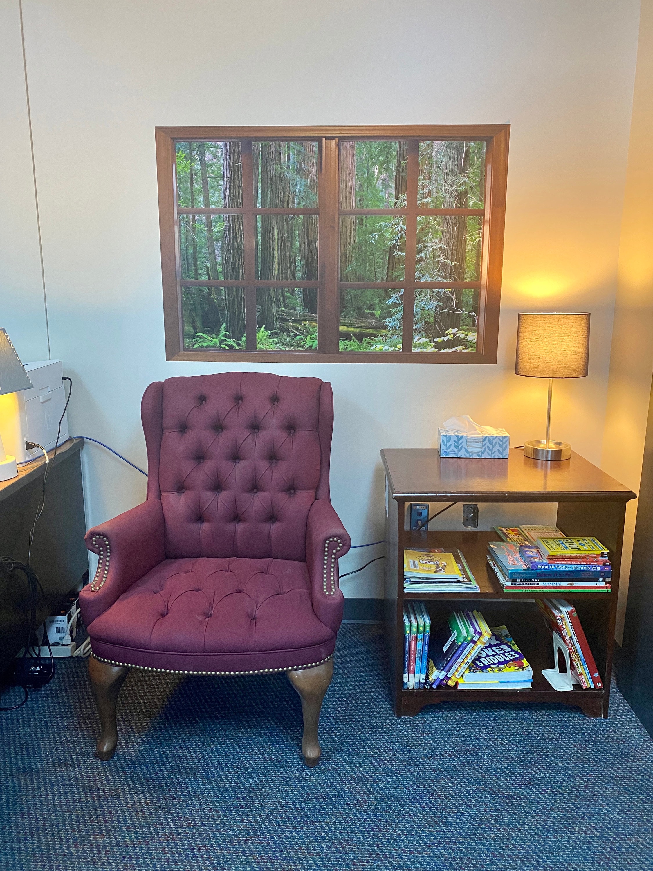 Faux window frame, photo wall decal with an image of a window frame and California redwoods in Muir Woods beyond.