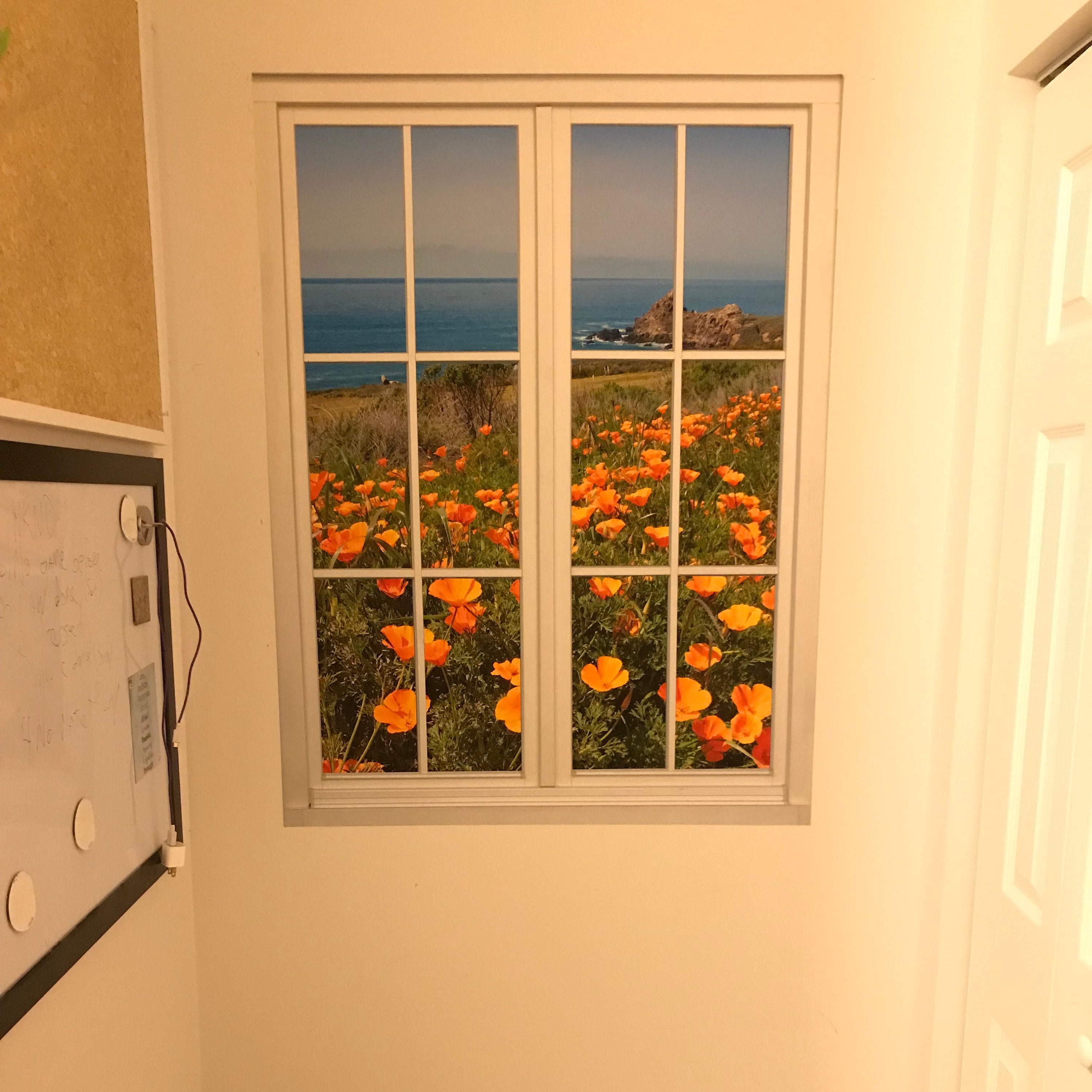 Faux open window frame, photo wall decal with an image of a window frame and field of California Poppys beyond.