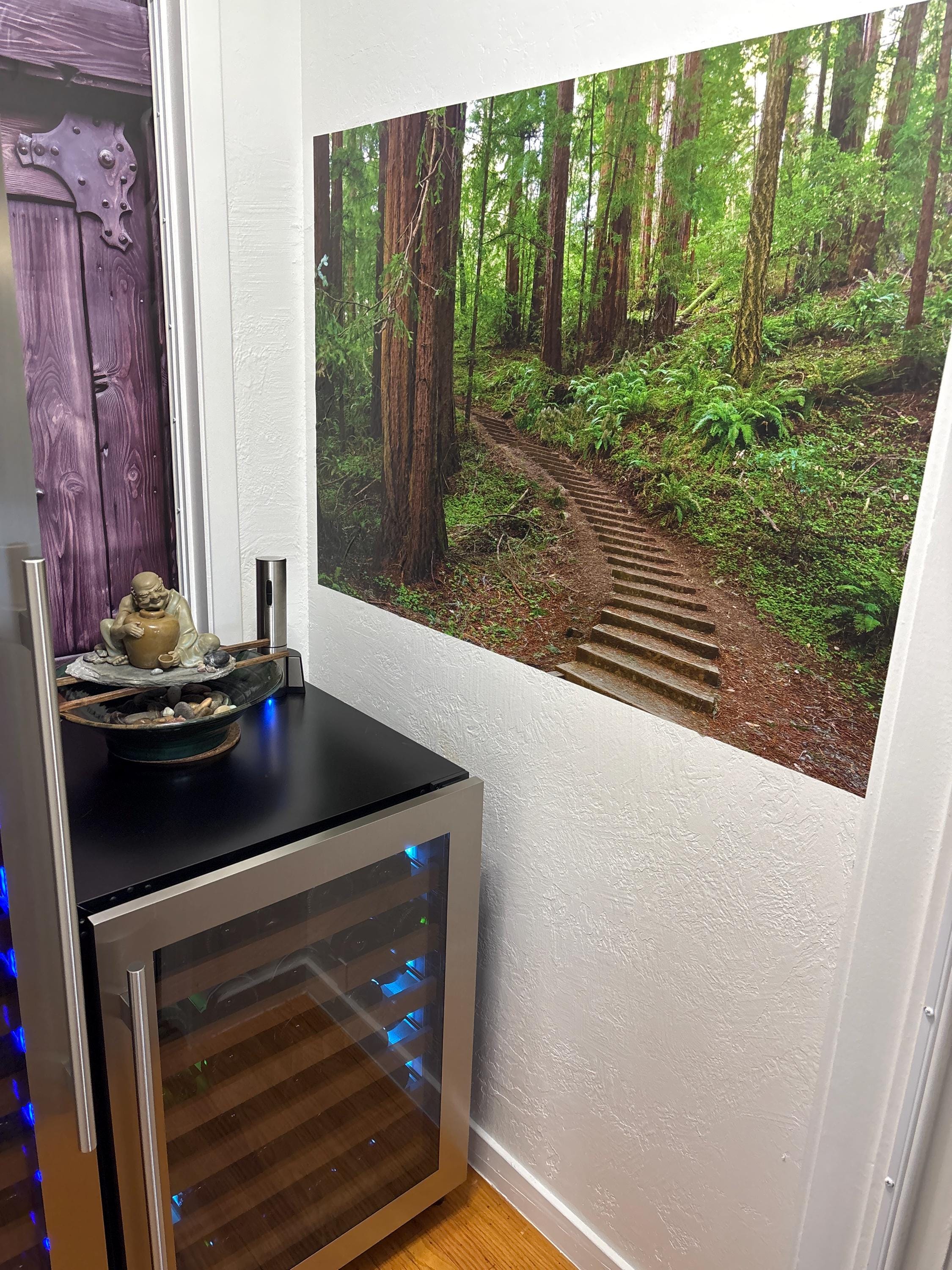Faux window frame, photo wall decal with an image of a window frame and California Muir Woods path beyond.