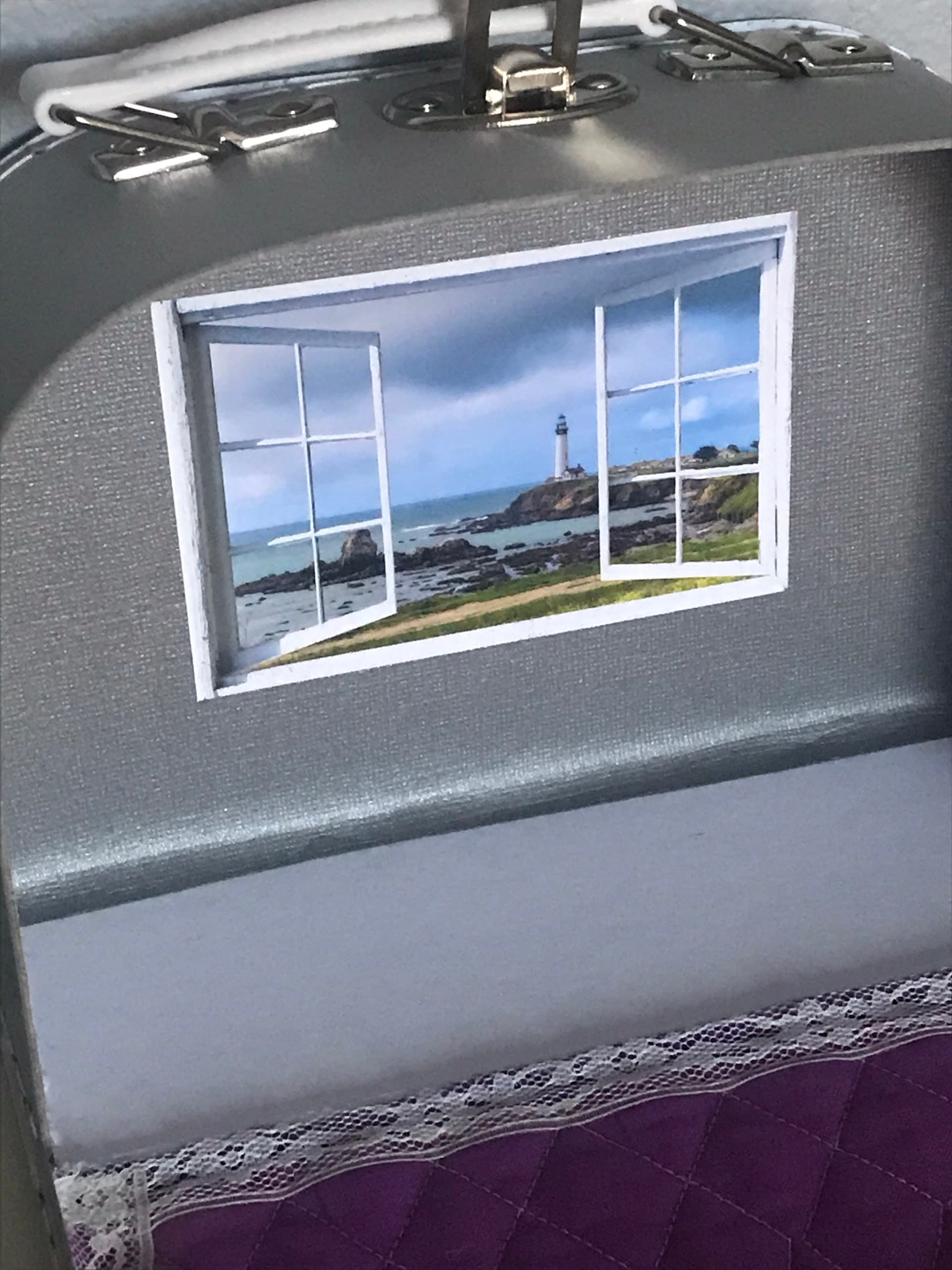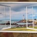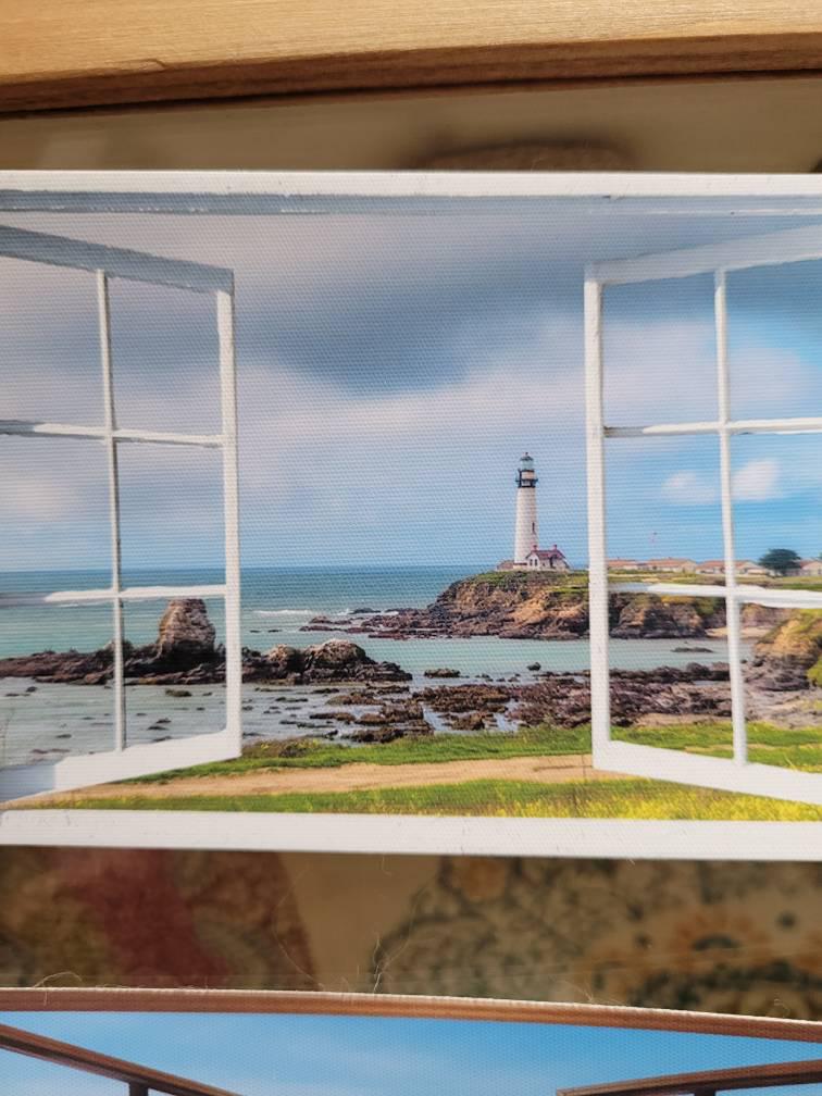 Mini wall decal for dollhouse with an image of a window frame and Big Sur Pigeon Point lighthouse beyond.